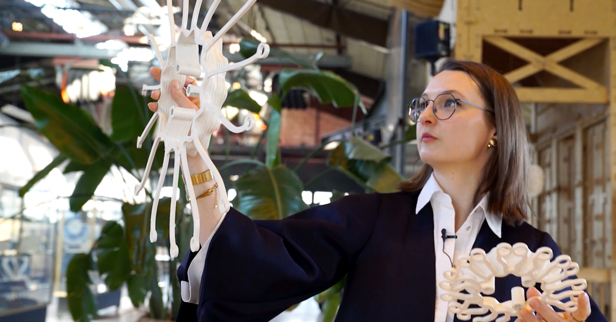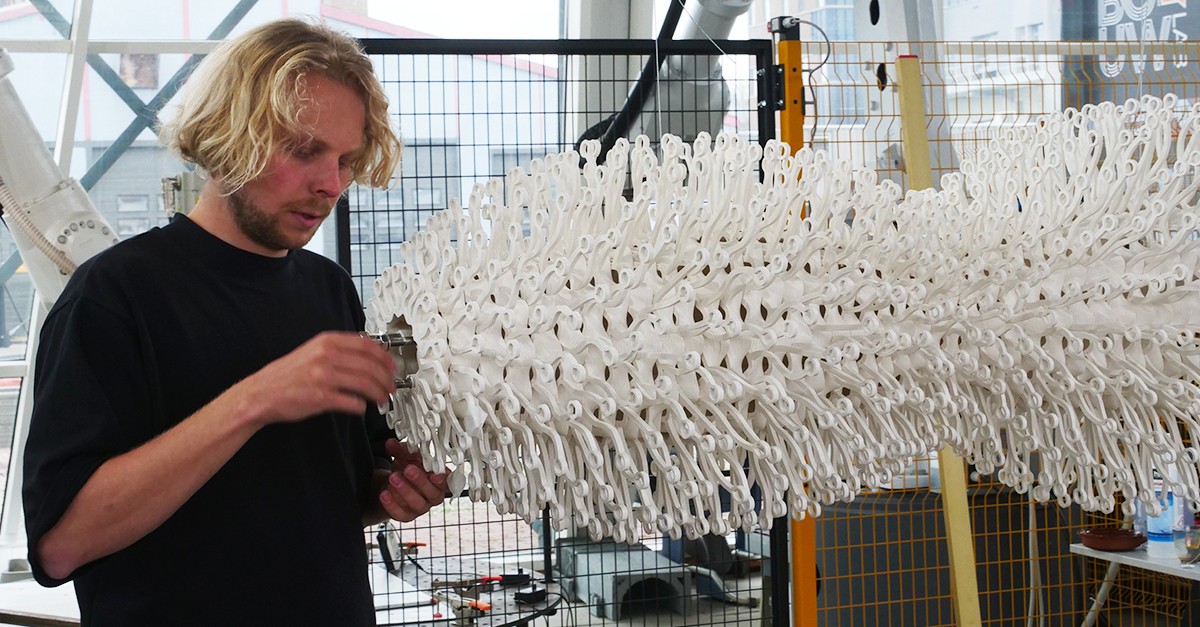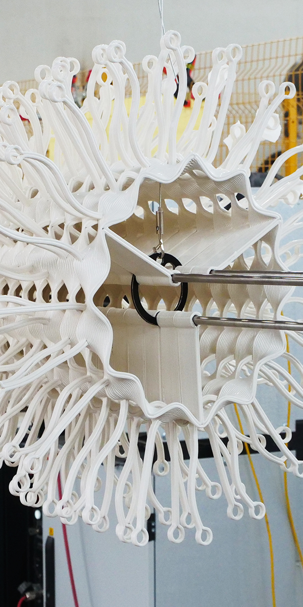 Kan het biopolymeer PHA gebruikt worden voor het 3D-printen van grote objecten? Met die vraag startte Simone van Es Interieurontwerp een materiaalonderzoek, vanuit haar missie om bio-based en circulair ontwerp verder te brengen. Binnen de ROOTS Foundation werkt zij met ontwerpers, leveranciers en producenten aan de verduurzaming van de ontwerp- en productiepraktijk. PHA is biologisch afbreekbaar in een natuurlijke omgeving en sluit daarmee goed aan op die ambitie. Tot nu toe werd het materiaal vooral toegepast in kleine FDM-printers. De uitdaging: hoe maak je de stap naar grotere objecten, met behoud van ontwerpvrijheid? Het onderzoek leidde tot het ontwerp van New Dawn, een 3D-geprinte lamp van 1,5 meter lang, die in 2025 werd gepresenteerd tijdens de Milan Design Week als onderdeel van de installatie The Last Supper. De lamp werd bekroond met de Masterly Milano Award.
