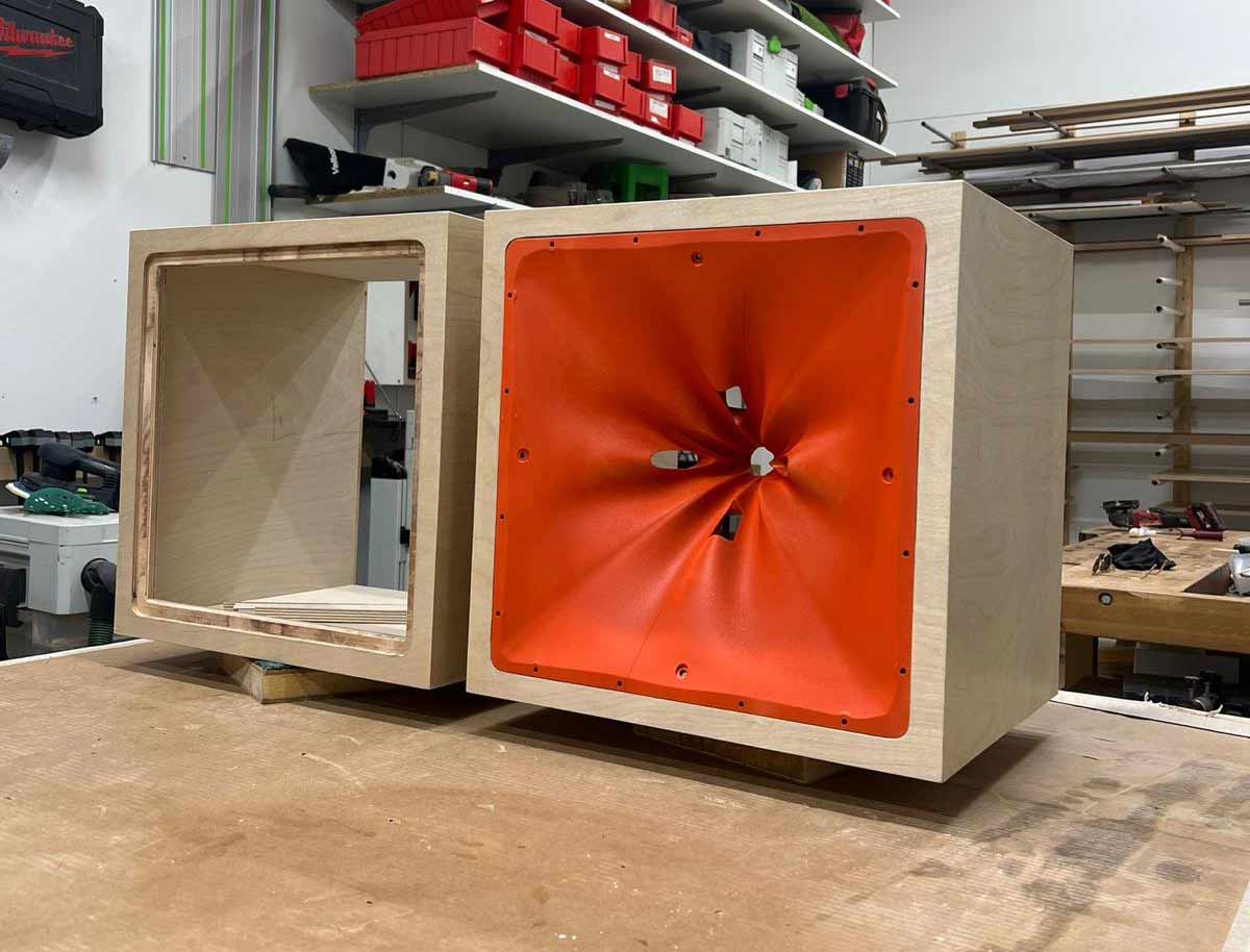 Traditioneel worden deze speakers gemaakt van multiplex. Dat werkt, maar heeft een duidelijke beperking: complexe vormen zijn vrijwel niet maakbaar. En juist die complexiteit maakt het verschil.