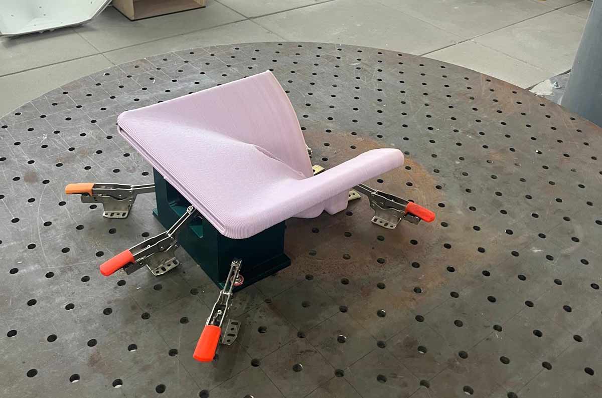 Dat gebeurt met behulp van LFAM 3D-printen, gecombineerd met 6-assig CNC-frezen in een multi-stage robotopstelling. Op deze manier kunnen grote, complexe vormen worden geprint en vervolgens nauwkeurig worden afgewerkt.